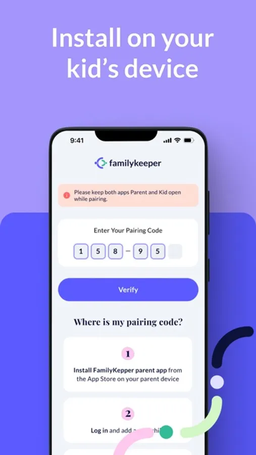 If you have already downloaded and registered FamilyKeeper on your device, you can now download and register FamilyKeeper Kids on your child’s device. Once this is done, you can quickly and conveniently pair the two apps using your unique pin code.