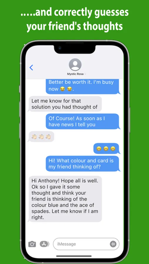 You ask your friend to pick up the phone (as you don’t want to touch it) and to read the full reply. They will be utterly amazed to see that the psychic has correctly guessed both the freely thought of colour and playing card.