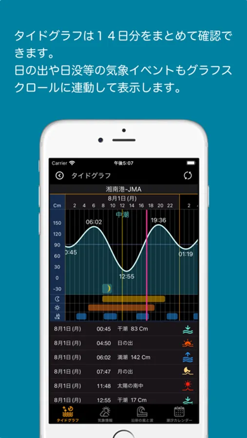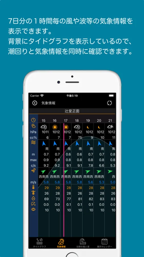 タイドポイントカードは、タイドグラフ、7日分の1時間毎の気象情報(風や波の情報)、沿岸の風と波情報、潮汐カレンダーをタブを切り替えて表示できます。