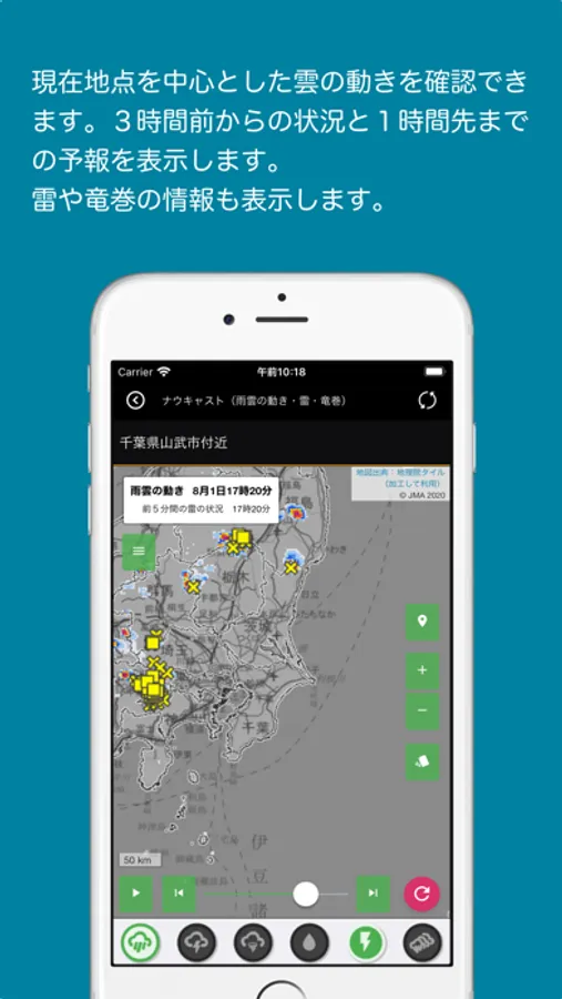 ナウキャストカードは、気象庁サイトより取得した、現在地点の雲の動きや雷/竜巻の予報をアニメーション画像で表示できます。