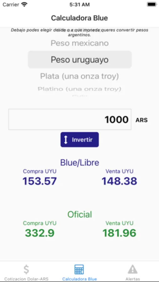 Ademas cuenta con una calculadora para convertir cualquier otra moneda usando la cotización del mercado libre, y alertas opcionales cuando el precio cambia.