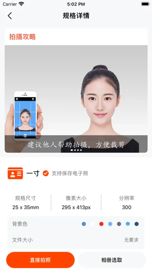 除证件照制作外,急速证件照还可制作1寸、2寸、5寸以及6寸的职业形象照,同时配有7种高端底色,帮您足不出户
