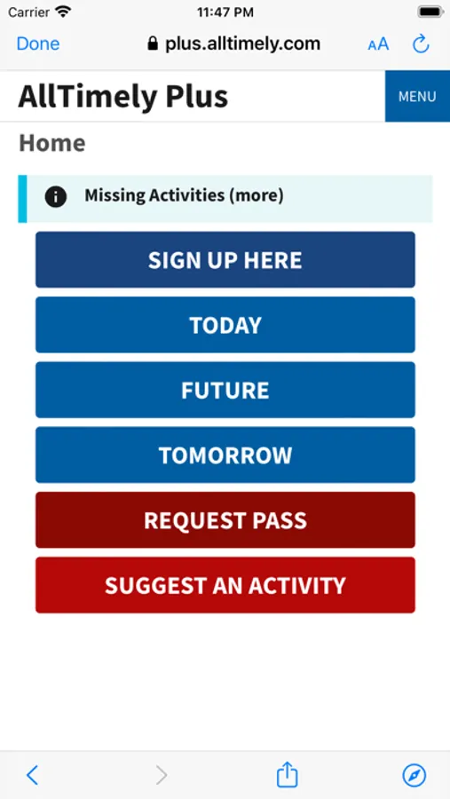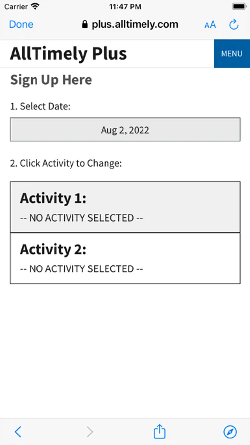 Students will login by selecting their school. They will then provide username/password credentials to the school-branded login school. Students will then select from these activities for the defined schools' days, and be notified accordingly if an activity is cancelled.