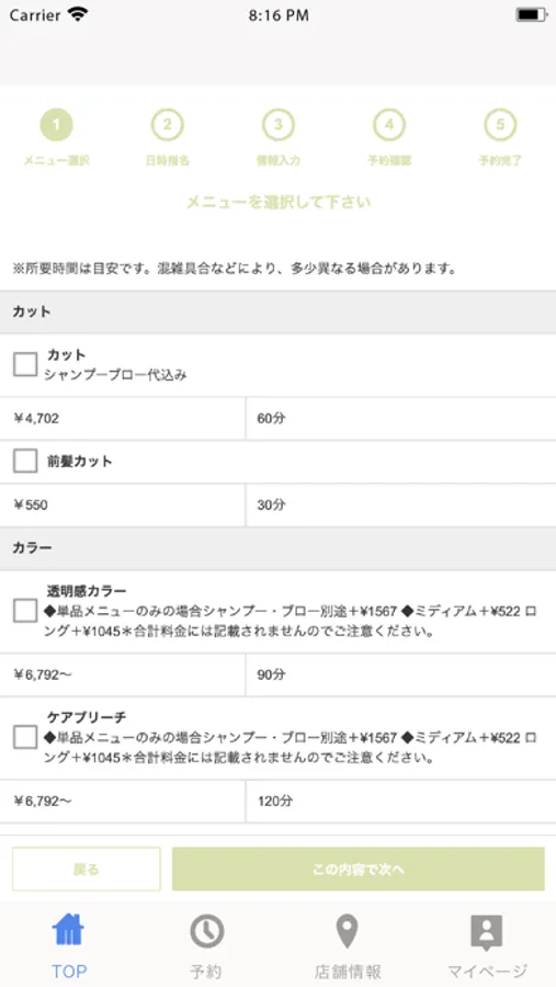 予約状況の確認やキャンセルがマイページ上から行えます。スタッフの登録が出来るので前もって担当者を登録しておけばマイページからスムーズな指名予約が可能です。