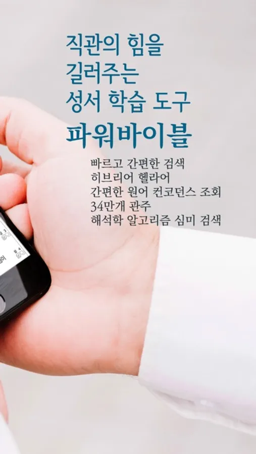 이 앱은 원문 해석 중심의 성경 학습 앱입니다. 성서신학 중심으로 구성한 주해 묵상을 매일 아침/저녁 알람으로 받아보고 함께 묵상하고 함께 통독합니다. 성경 히브리어와 헬라어 파싱(분해)을 지원합니다. 원어 중심의 각 어휘를 잇는 컨코던스(용례 색인) 조회도 가능합니다. 특히 성서신학 관점에서 70인역의 중요성을 그대로 반영했습니다. 올바른 원전 해석을 위한 직관의 힘을 기른다는 기치 아래 설계된 ‘파워바이블’ 앱은 빠르고 간편한 검색부터 각 구절의 34만개 관주와 주석을 이어주는 웹 기반 앱입니다. 해석학 알고리즘으로 작동하는 심미적 검색 또한 시연 중에 있습니다.