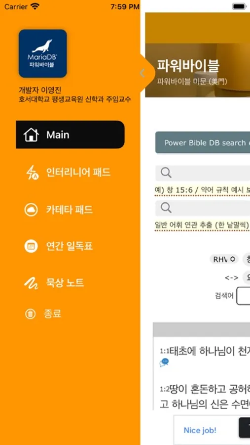 ◎ 다소 전문적인 기능 앱이지만, 하나님 말씀을 가까이 하고 그 해독의 진수를 파악하고자 하는 일반인 누구에게나 유용한 앱이 되기를 바랍니다. 감사합니다. _개발자 이영진.