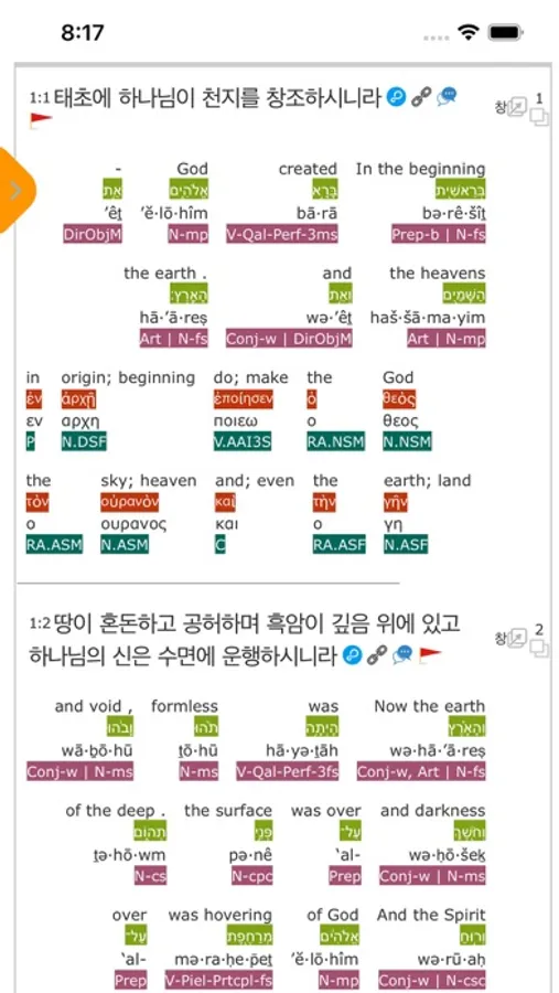 히브리어와 헬라어의 기본 파싱은 물론 해당 어휘의 성경 용례/색인을 볼 수 있는 기능입니다.