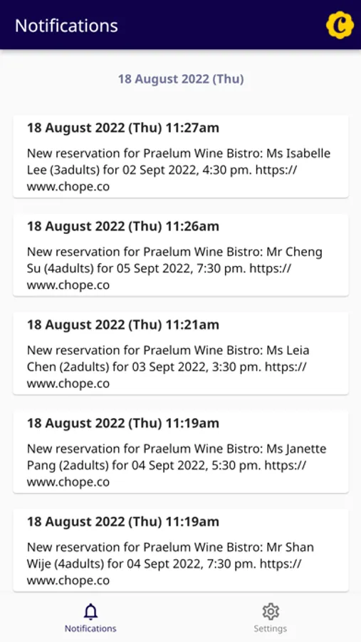 Exclusively for Chope merchants, our notifications app enables you to receive timely and convenient updates on new, updated or cancelled reservations for your restaurant. This app can be shared with all your staff members at no cost.