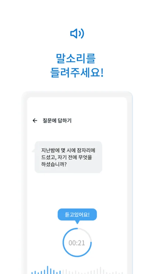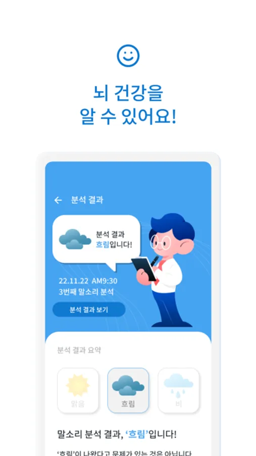 (주의) 맑은내친구는 의료적인 진단을 하는 서비스가 아닙니다. 이 앱에서 나오는 말소리 분석 정보는 인공지능을 기반으로 학습한 데이터와 유사성이 있는지를 판단하는 결과일 뿐입니다. 이 분석 결과를 의료적으로 활용하실 수 없습니다. 의학적인 진단이 필요하시면 반드시 의사의 조언을 구해야 합니다.