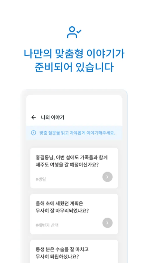- AI의 개인 맞춤 질문을 통해 나만의 이야기를 만들어 갈 수 있어요.
