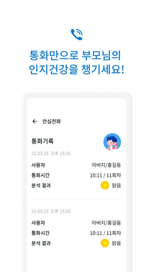 - 맑내는 통화 시 부모님의 말소리를 분석해서 뇌건강을 챙겨드려요.