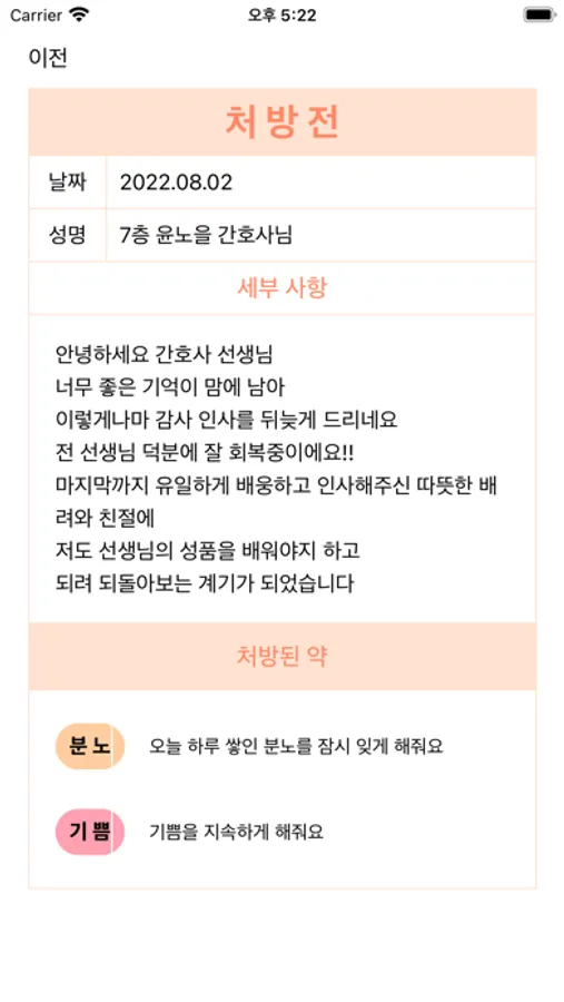 편지는 처방전 편지지가 준비되어 있으며, 원하는 병원에 보낼 수 있으며 해당 병원 간호사가 확인할 수 있습니다.