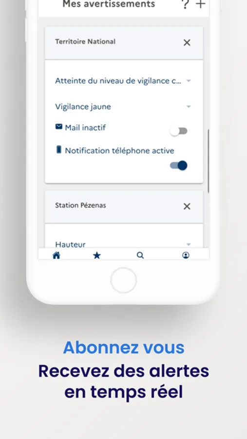 Les avertissements permettent de recevoir des notifications lors d’un changement de la couleur de vigilance crues sur un tronçon de cours d’eau, un territoire, ou un département ; et de recevoir des notifications lorsque le niveau du cours d’eau dépasse le seuil choisi par l’utilisateur sur une station.