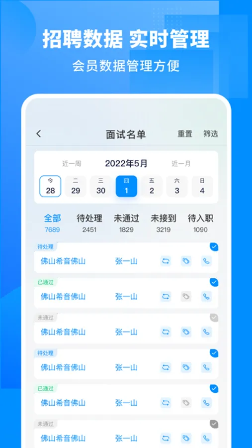 【招聘管理】:可以查看招聘员,会员各流程流转状态