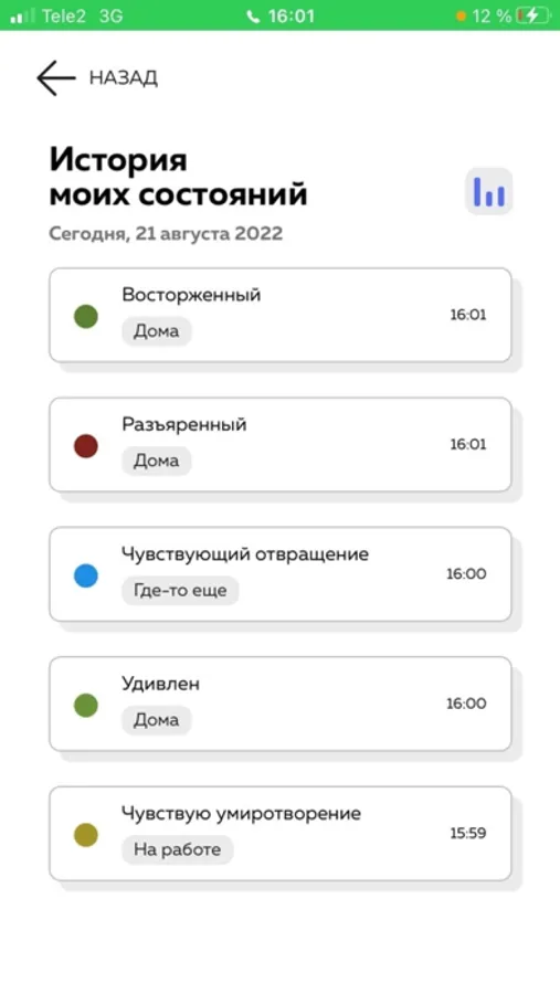 История состояний поможет отследить ваше эмоциональное состояние на протяжении недели/месяца, чтобы повысить энергию и ресурсное состояние.