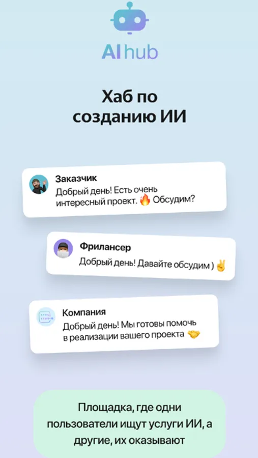 AI hub - площадка, где одни пользователи ищут услуги ИИ, а другие их оказывают.