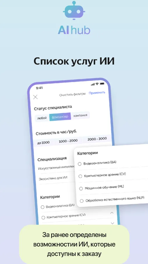 Для Покупателя доступен список всех специалистов ИИ с возможностью их фильтрации по конкретным услугам и другим параметрам.
