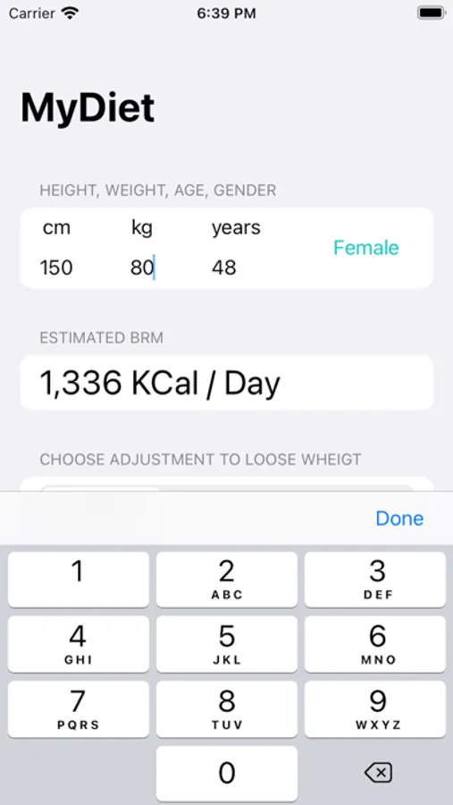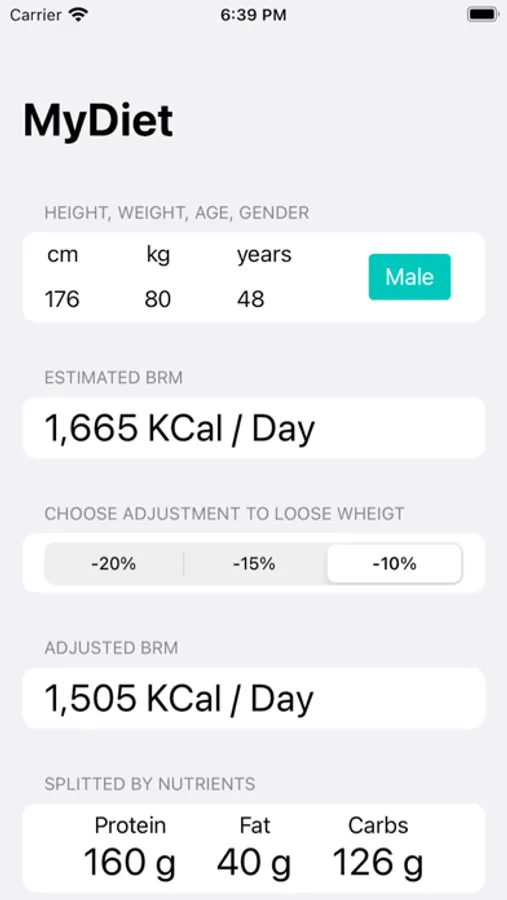 A small one-view app to adjust daily Basal Required Measurements(BRM) to loose weight. Just input your metrics and get a number of protein, fat a carbs in grams you need daily to get the best shape of your body. Also you able to adjust daily consumption up to - 20% from estimated demand as a more healthy way to get a goal.