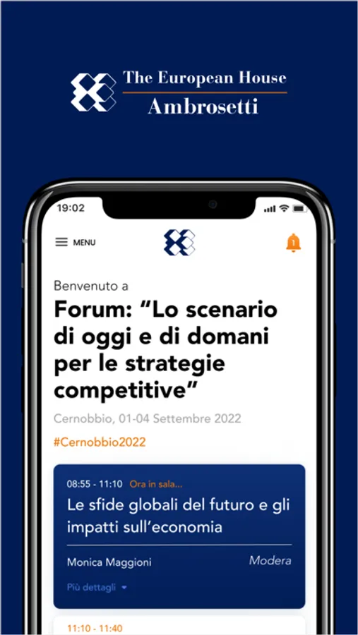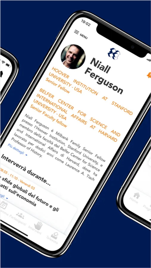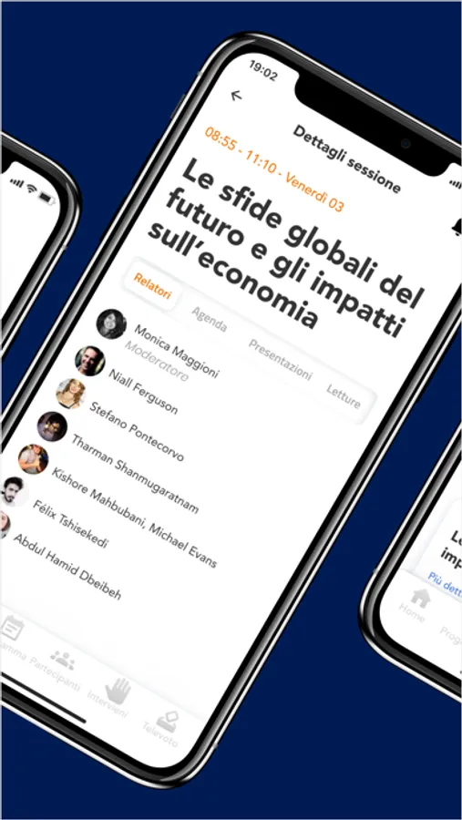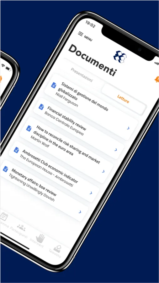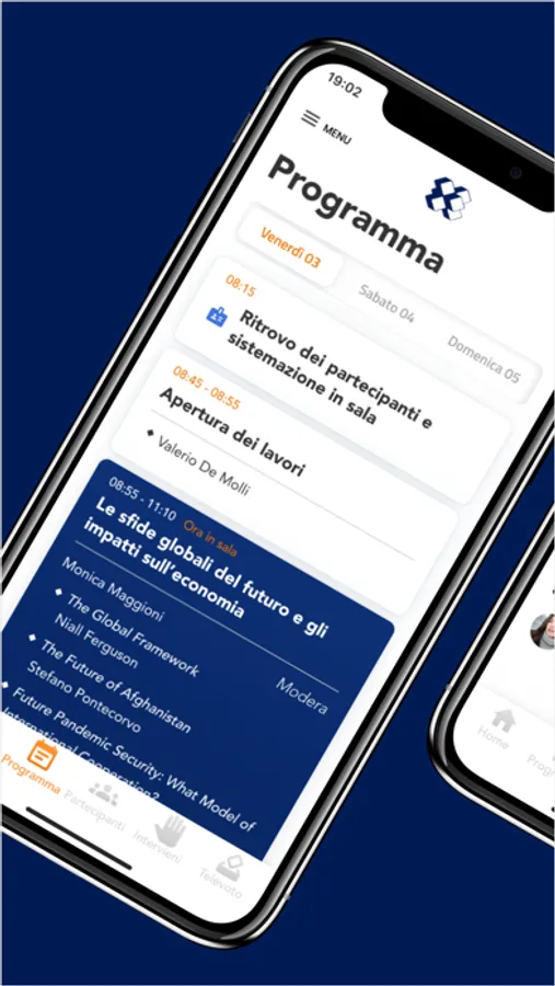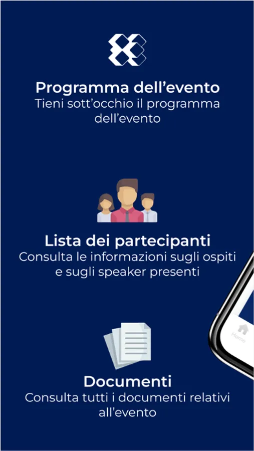 Dal Menu principale è possibile visualizzare il programma dell'evento a cui si partecipa, consultare i documenti caricati in preparazione e durante l'evento, conoscere i dettagli di ciascuna sessione, così come dei relatori presenti.