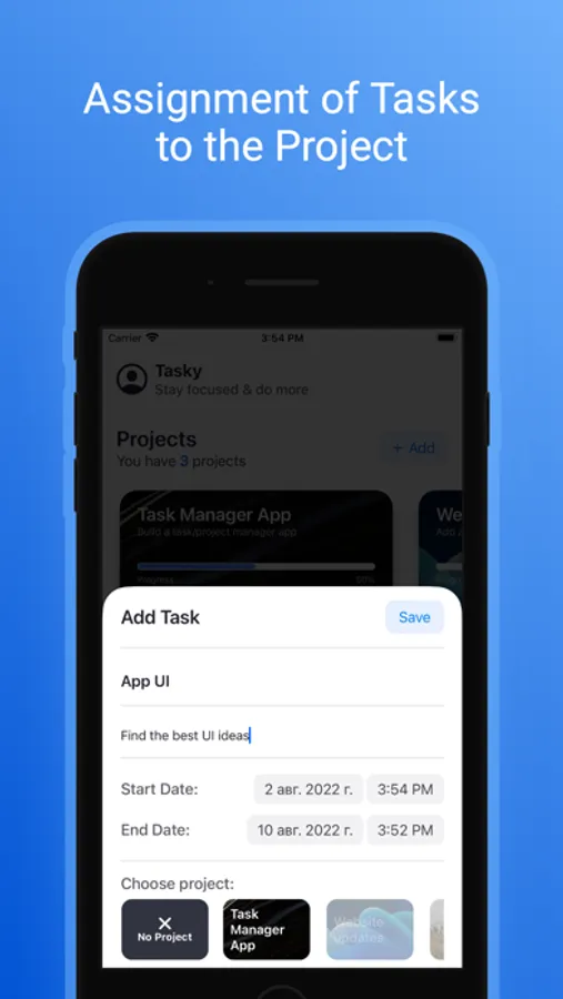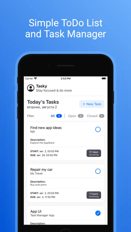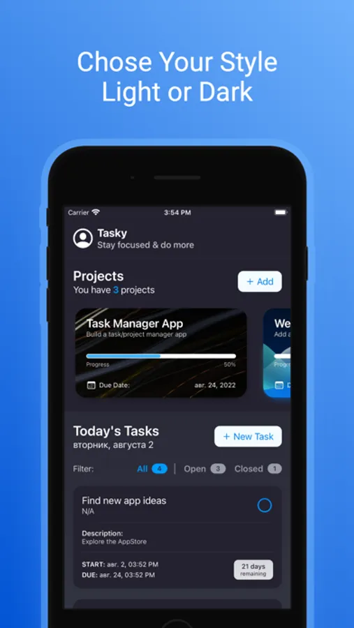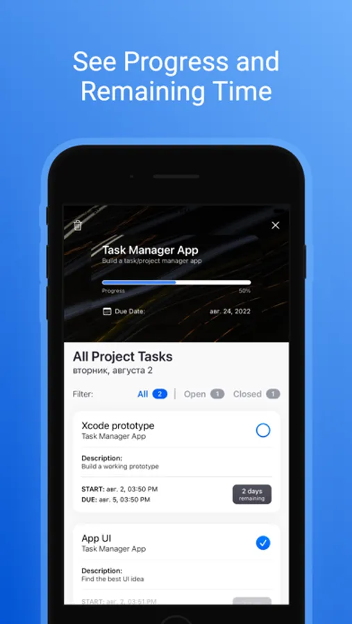 Simple and easy to use task and project management app for iPhone. Add projects and tasks, set a due date, see progress and remaining time.