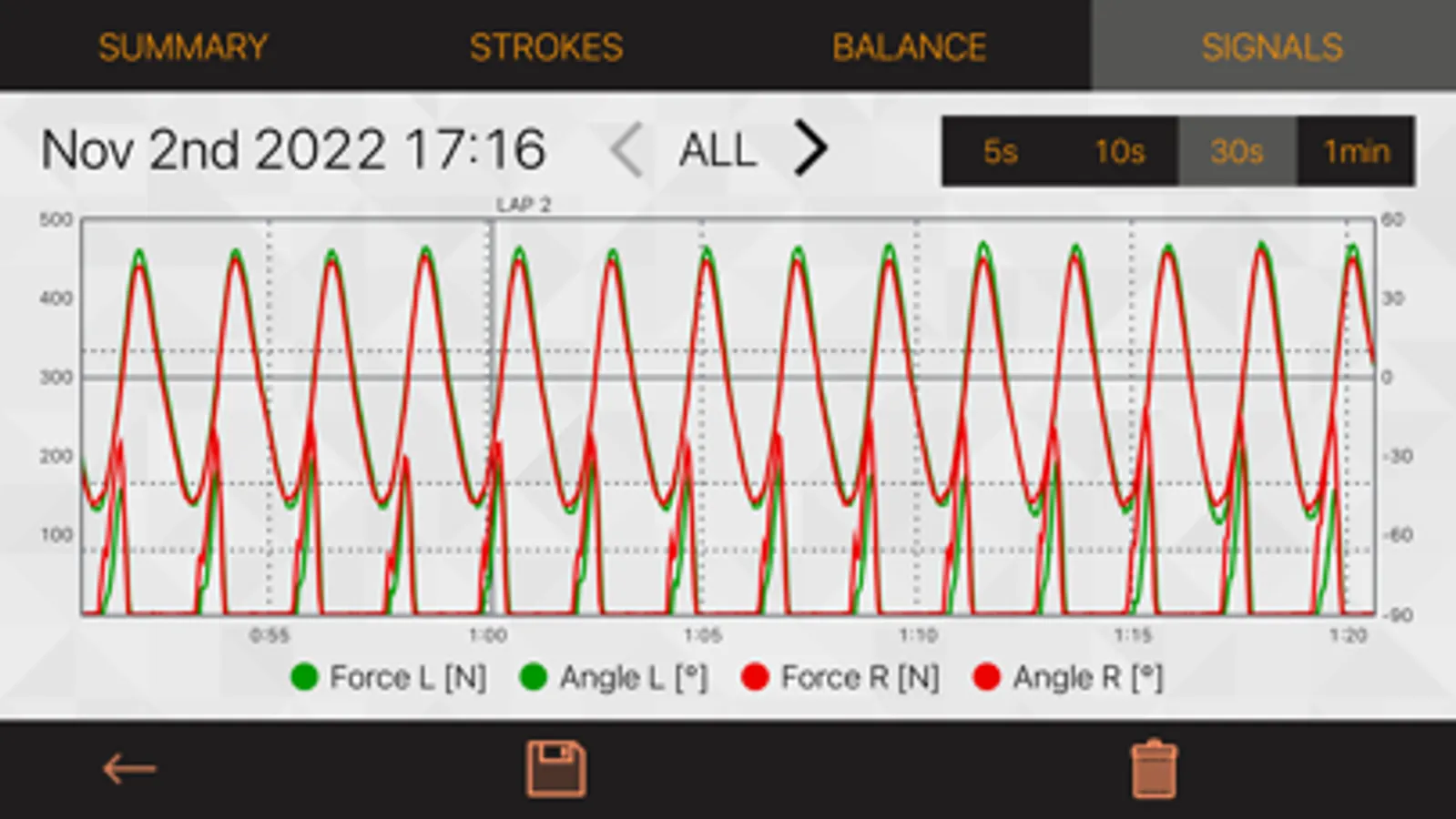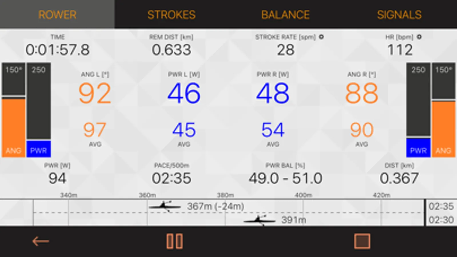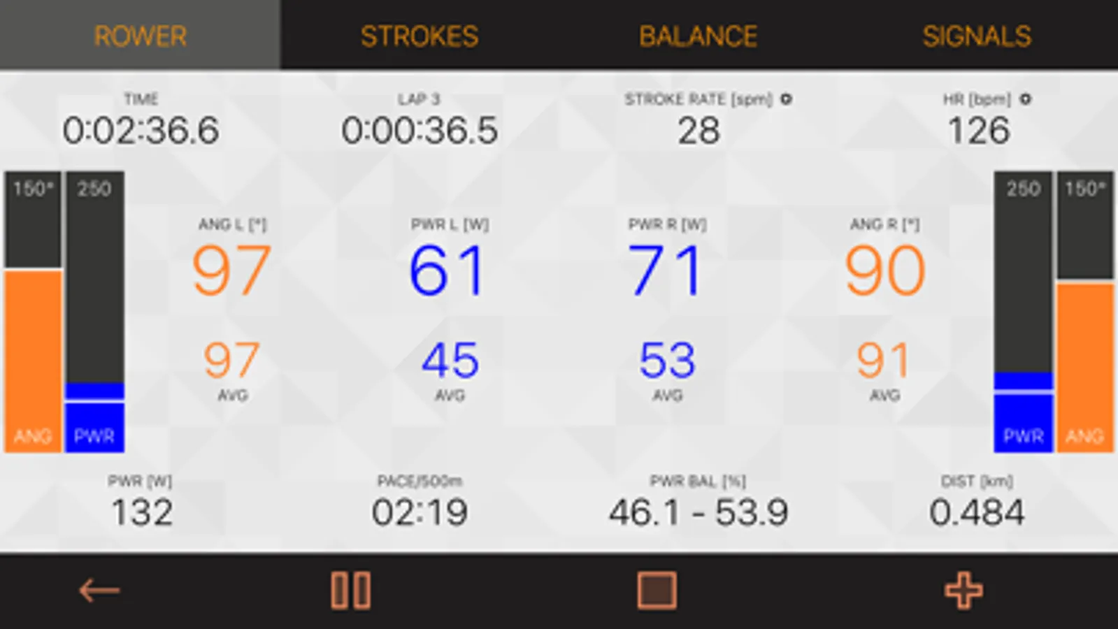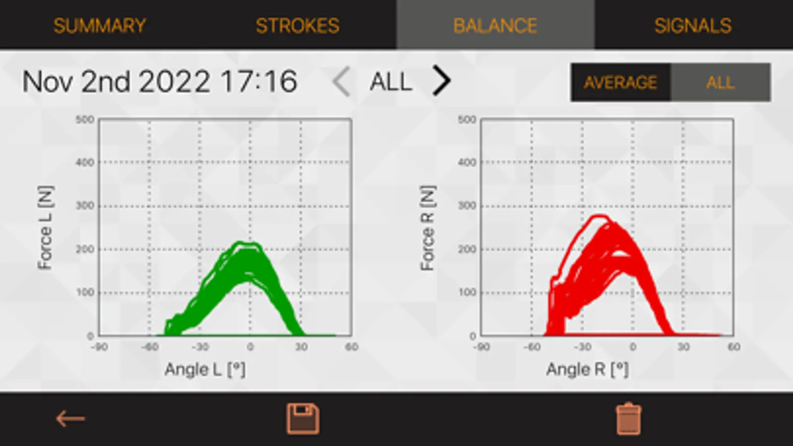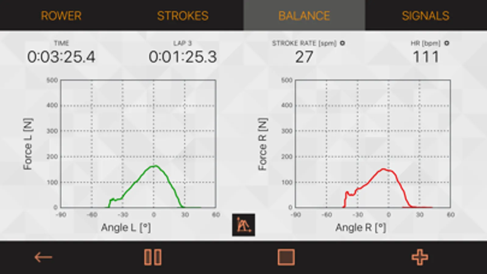 The ROWER view displays per stroke values of power and angle for each hand separately. The BALANCE and SIGNALS views show real time force by angle and force by time curves, enabling you to analyse your rowing technique.