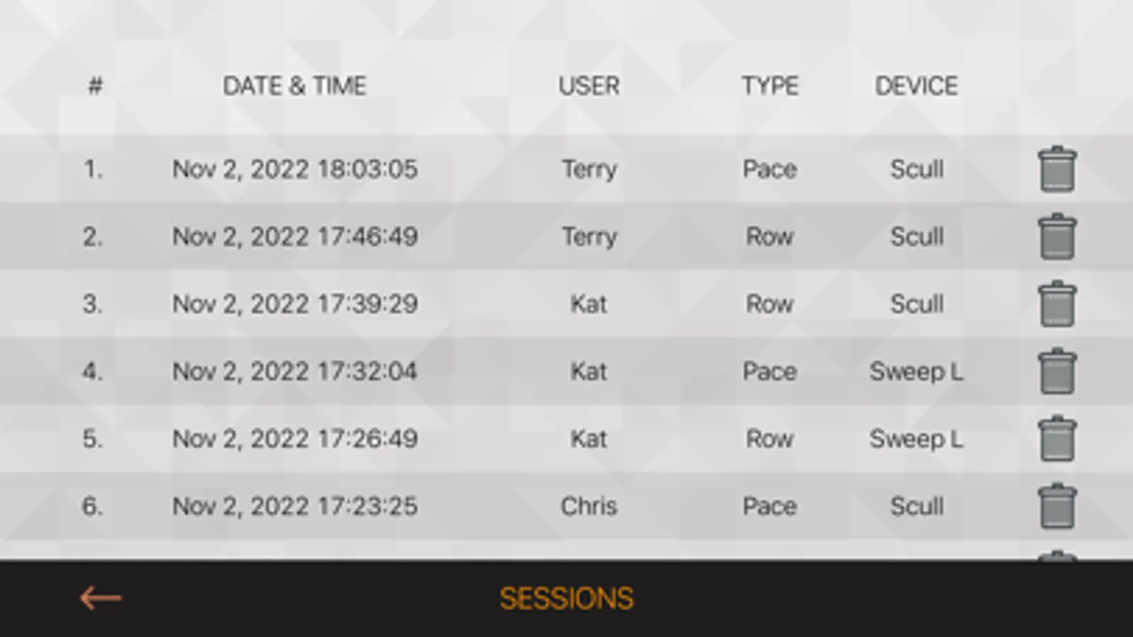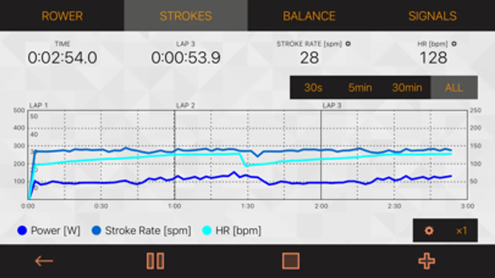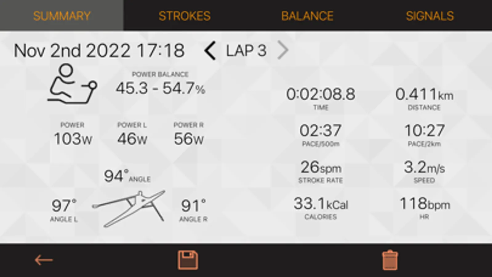 The STROKES view charts up to 3 per stroke parameters. These parameters are customizable. There are many parameters available to display: power, angle, stroke rate, heart rate, pace, etc.