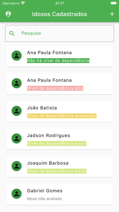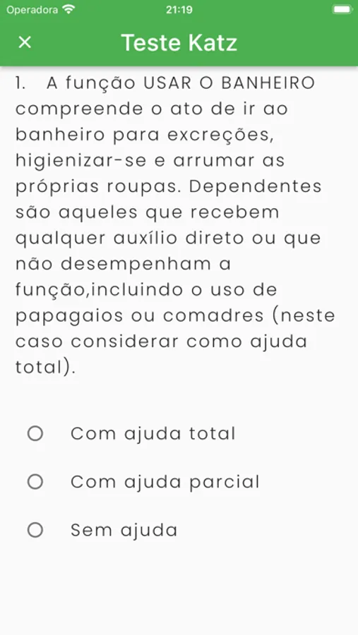 O App permite que o cuidador o próprio idoso faça uma avaliação para verificar o nível de dependência de cuidados.