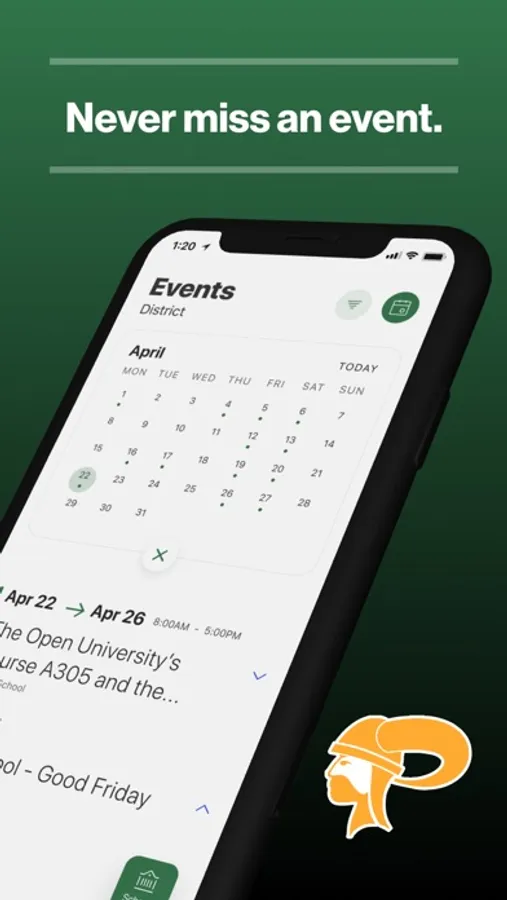 The event section shows a list of events throughout the district. Users can add an event to their calendar to share the event with friends and family with one tap.