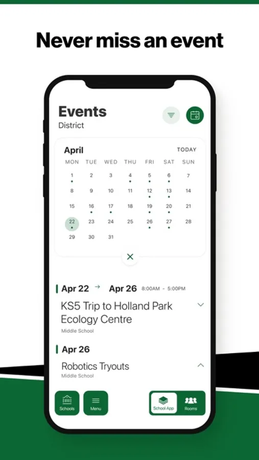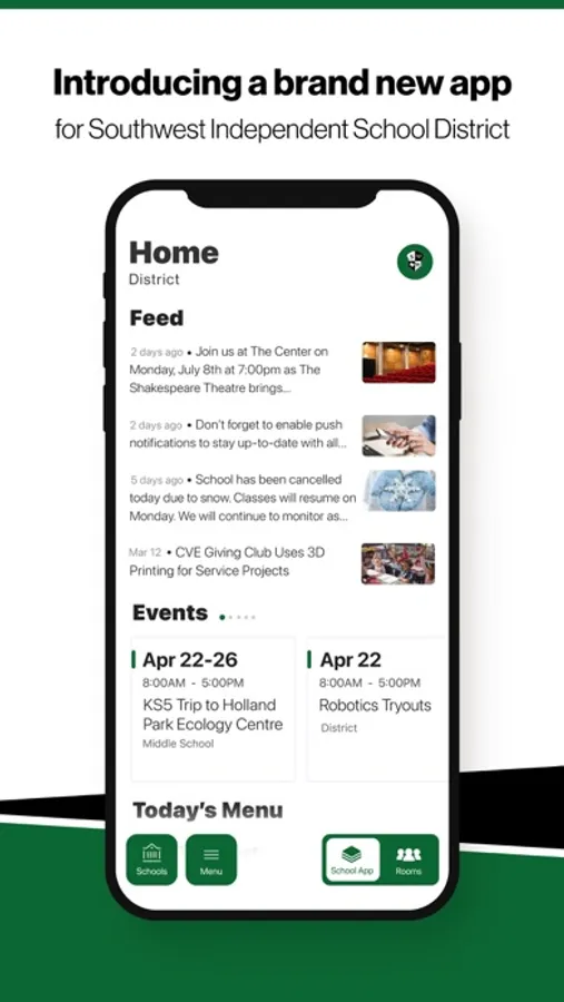 The event section shows a list of events throughout the district. Users can add an event to their calendar to share the event with friends and family with one tap.