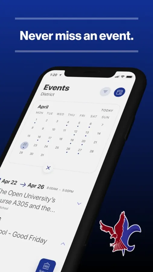 The event section shows a list of events throughout the district. Users can add an event to their calendar to share the event with friends and family with one tap.