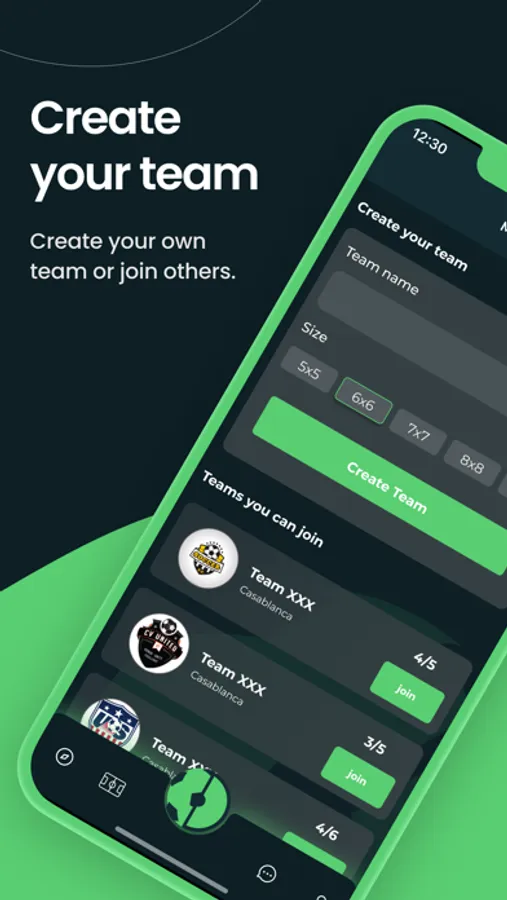 Create a team, invite your friends to join you or search new players around you, once your team is full, plan games and search opponents to play against, book your prefered field. use Chi Match Chat to communicate with teammates and opponents.