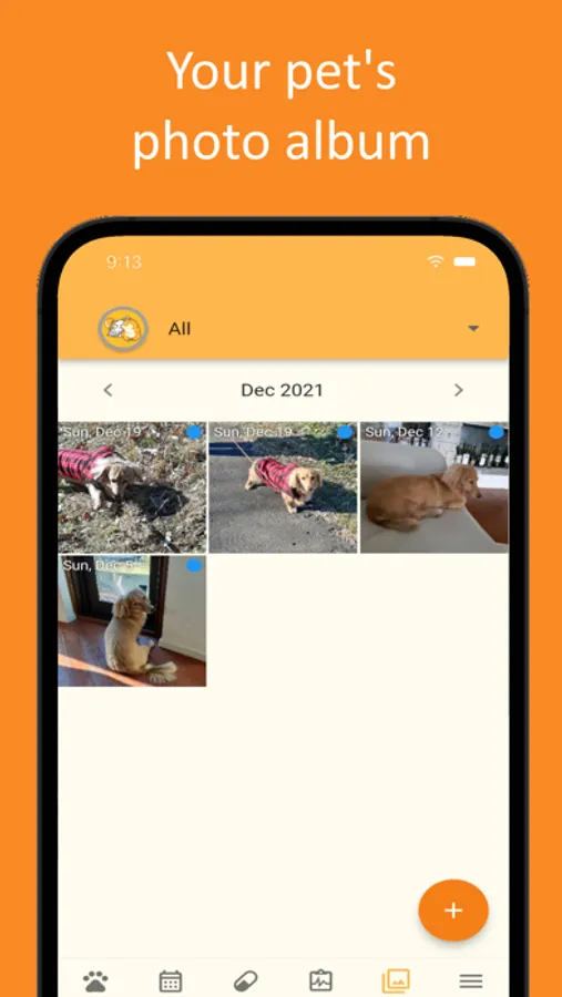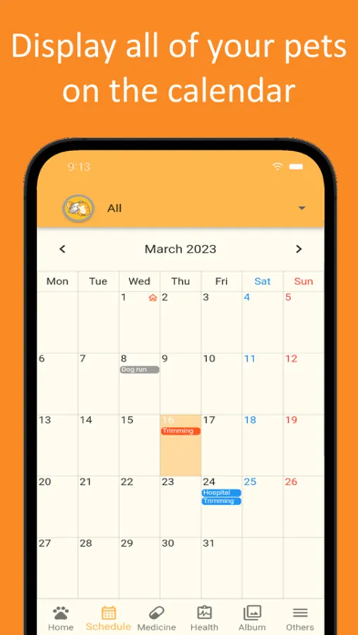 Use the calendar to manage your pet's schedule. Register your pet's birthday or gotcha day to display special icons on those dates.