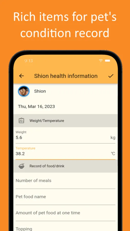 Track your pet's physical condition such as weight, body temperature, food intake, and excretion on the calendar. A paw mark will be displayed on the days you record these details.
