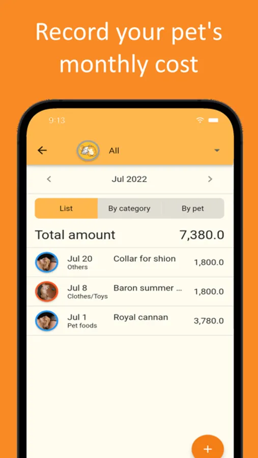 Record and manage monthly pet expenses by category such as pet food, grooming, and toys.