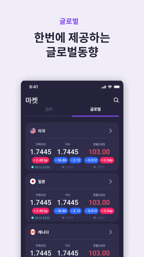 - 나라별 지수, 환율, 금리를 한번에 제공하는 글로벌 동향 제공