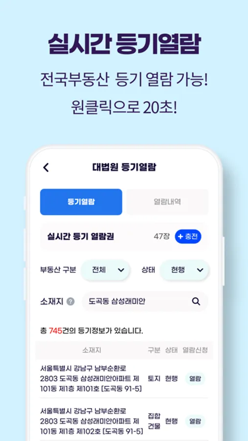 • 타 사이트 방문없이 대법원 등기부등본, 토지대장, 건축물대장 열람