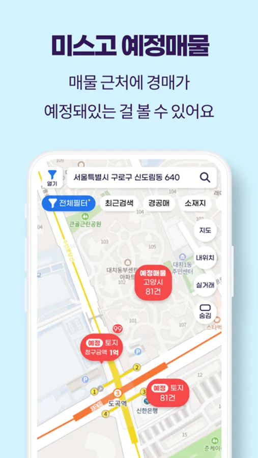 • 위치 정보: 인근 매물 검색, 지도 매물 표시
