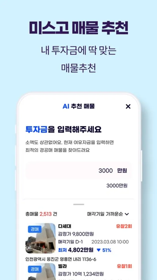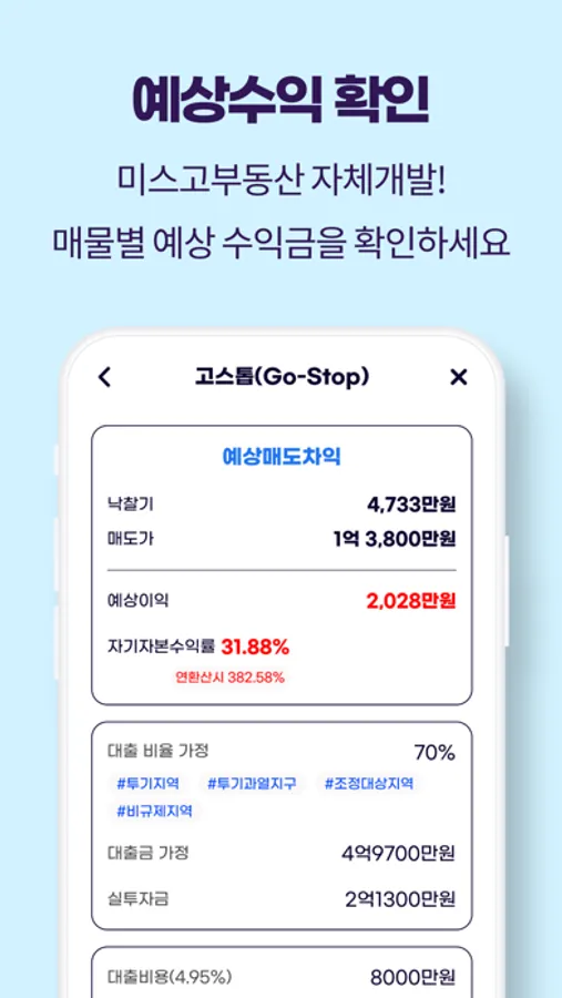 • 실투자금만 입력하면 세금 및 대출 비중을 적용한 매물 추천