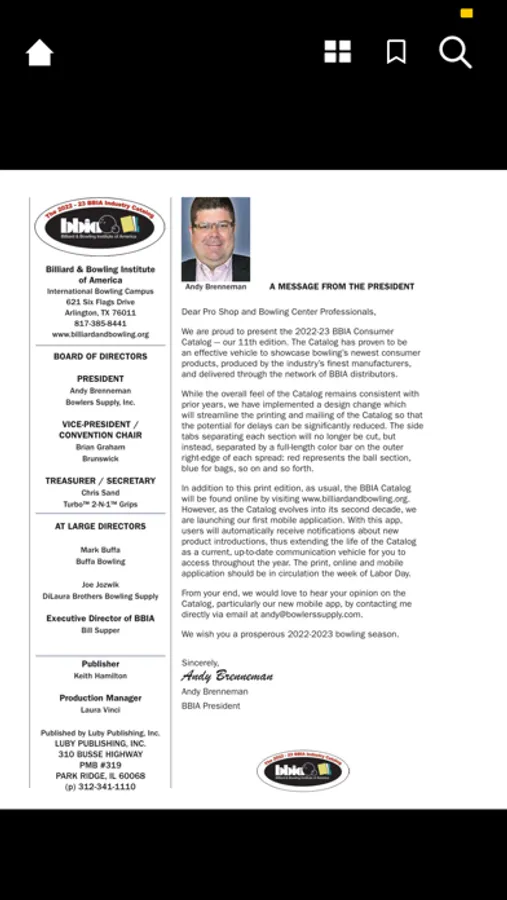 THE BILLIARD & BOWLING INSTITITUE OF AMERICA IS PROUD TO UNVEIL ITS FIRST MOBILE APPLICATION OF ITS ANNUAL CONSUMER BOWLING CATALOG. IN ADDITION TO OUR PRINT CATALOG, WHICH IS PRODUCED ANNUAL AND ARRIVES TO BOWLING RETAILERS EACH SEPTEMBER, THE MOBILE WILL ALLOW CONSUMERS TO VIEW BOWLING’S NEWEST CONSUMER BOWLING PRODUCTS THROUGHOUT THE YEAR VIA THEIR TELEPHONES OR TABLETS. THE GREATEST VALUE OF THE APPLICATION IS THAT WHEN NEW PRODUCTS ARE LAUNCHED, USERS WILL RECEIVE NOTIFICATIONS OF THE UPDATES. TO LEARN MORE ABOUT BBIA, PLEASE VISIT OUR WEBSITE AT WWW.BILLIARDANDBOWLING.ORG.
