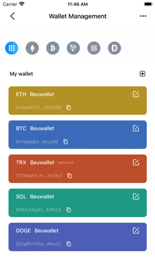 1. Multi-chain wallet, supporting blockchain assets such as BTC/ETH/TRX/USDT/SOL/DOGE