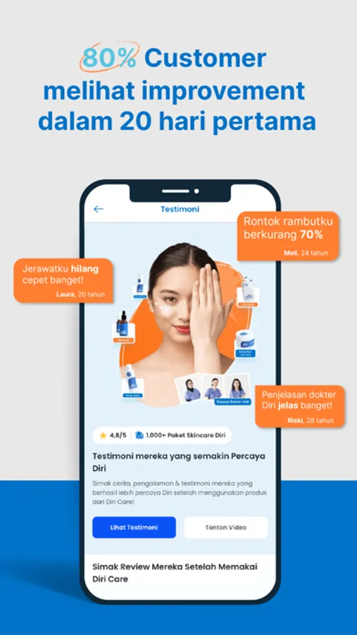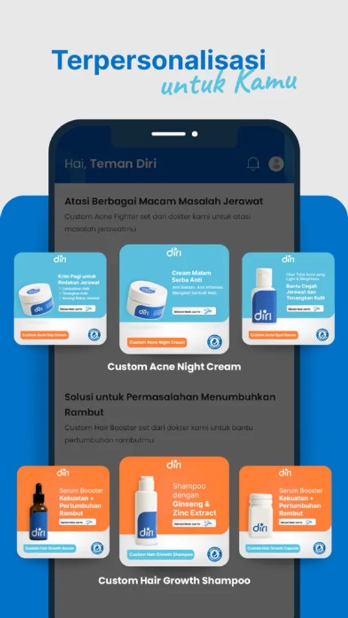 Diri hadir sebagai klinik kesehatan dan kecantikan online yang bisa membantu Anda merawat diri dengan tepat, cepat, serta terjangkau. Mulai dari konsultasi, diagnosa, pengiriman obat atau produk, sampai komunikasi berkelanjutan dengan tim klinis, semuanya terintegrasi di satu platform. Tim dokter dan klinis berpengalaman kami siap memberikan solusi yang dipersonalisasi untuk setiap kebutuhan kesehatan kulit, kecantikan, dan rambut.