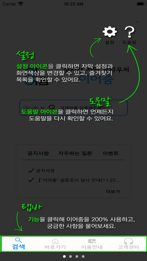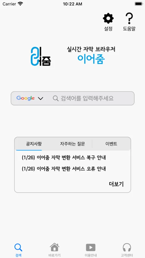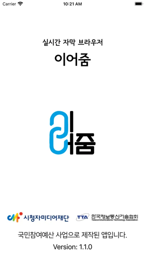 “이어줌“은 청각장애인의 모바일 시청환경 개선을 위해 개발된 애플리케이션 서비스로, 영상속 음성신호를 자막으로 변환하여 화면에 표시합니다.