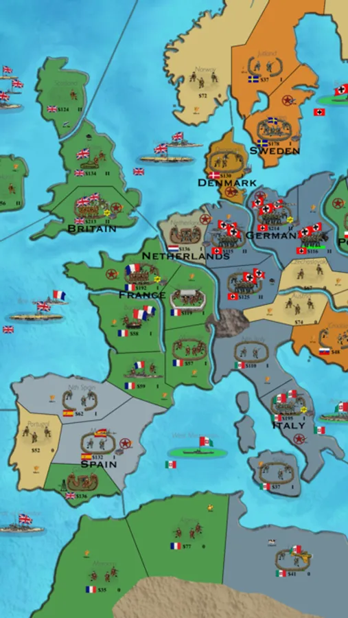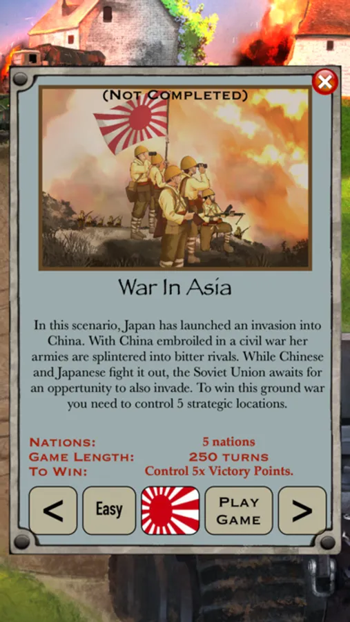 World at War (WW2) is a turn-based game pitting the various major and minor powers against each other. This war game is based on the WW2 conflict and plays through scenarios that increase in difficulty and complexity. Use your land, air and sea forces to spread and dominate the world. As one of the major powers, you can recruit minor countries or conquer any country standing in your way to victory.