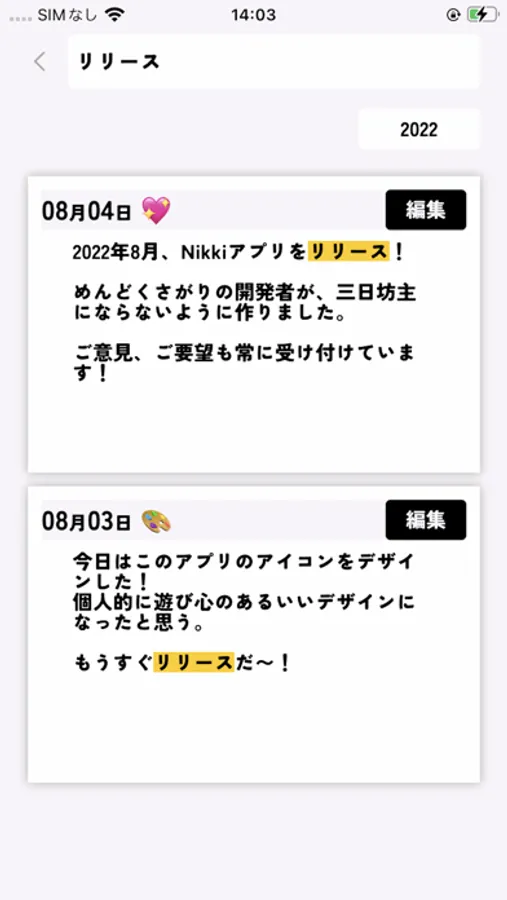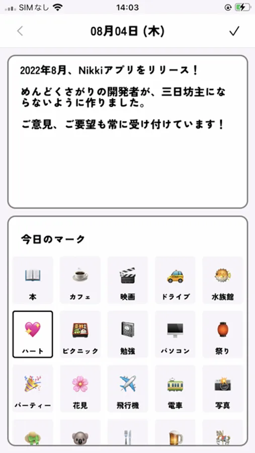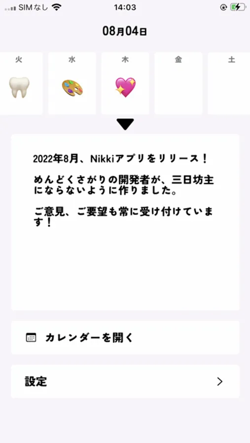 アプリを開いてワンタップで手軽に日記を書けるデザインになっています。