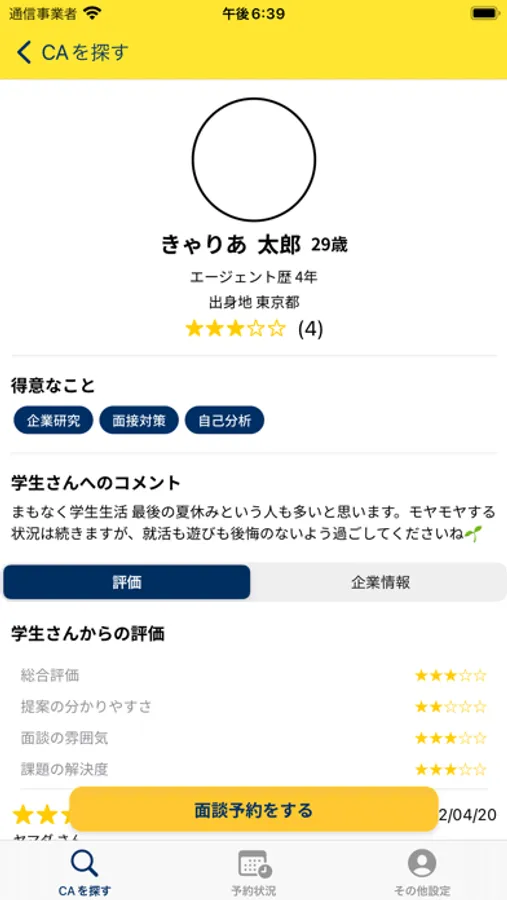 過去に相談した学生の口コミを参照しながら、相談したいアドバイザーを選ぶことができます。