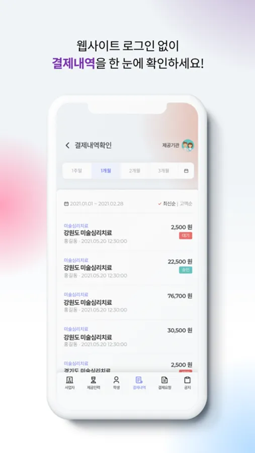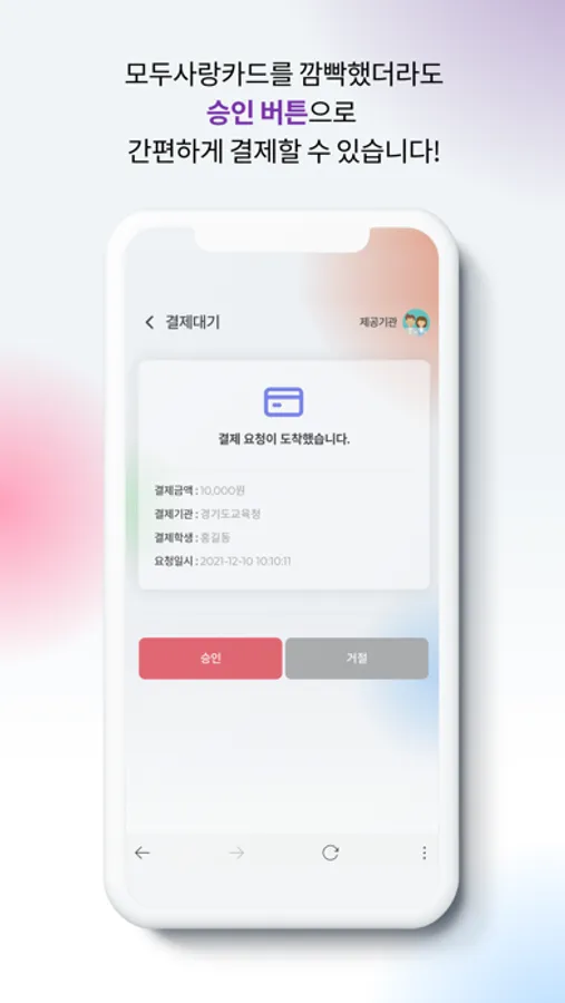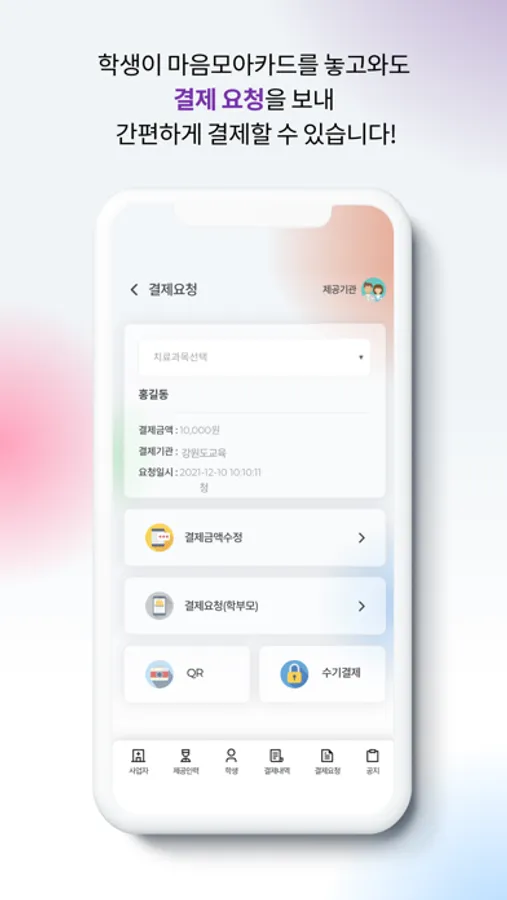 마음모아카드를 가져오지 않은 학생이 있더라도 모바일앱을 설치한 학부모에게 결제요청을 발송하여 결제할 수 있습니다.