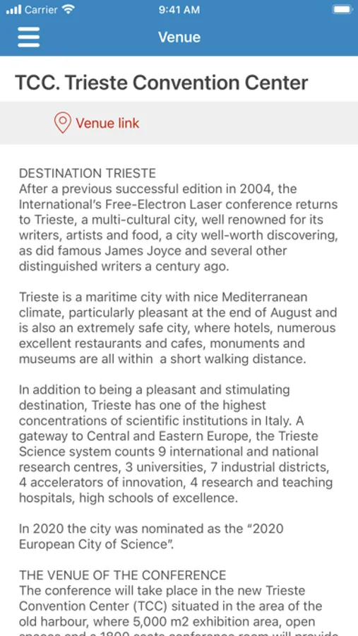 The app will guide you through the 40th International FEL Conference (FEL2022), Trieste Convention Center (TCC) Trieste (Italy),August 22-26, 2022. FEL 2022 focuses on recent advances in free electron laser theory and experiments, electron beam, photon beam, undulator technologies, and applications of FELs. This year edition is organised by Elettra Sincrotrone Trieste (www.elettra.eu).