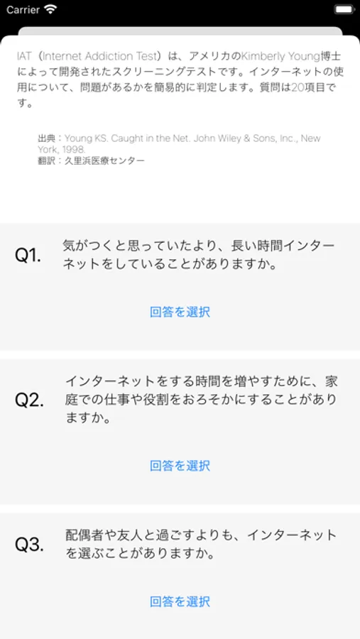 質問に対して選択肢で回答するだけで、依存度の簡易的なセルフチェックが行なえます。