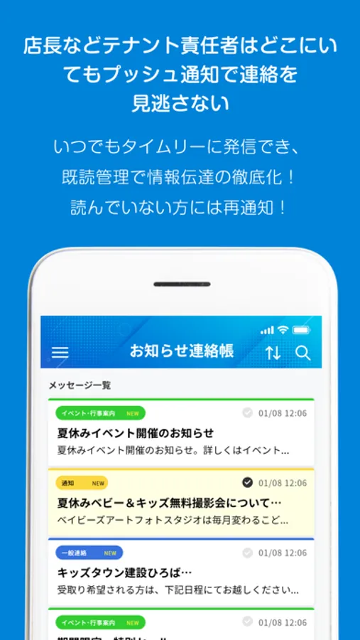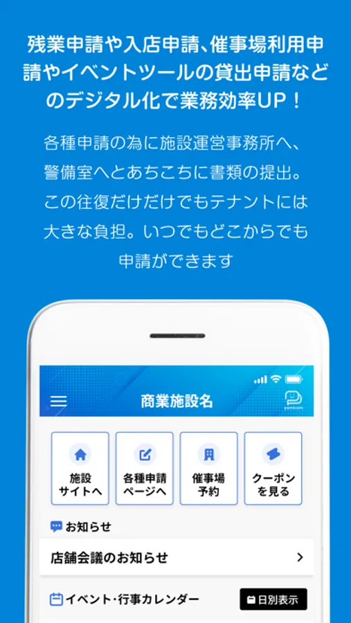 Yumicomは商業施設のオーナー様と施設を利用する各事業所様とのコミュニケーションを活性化、促進するアプリです。