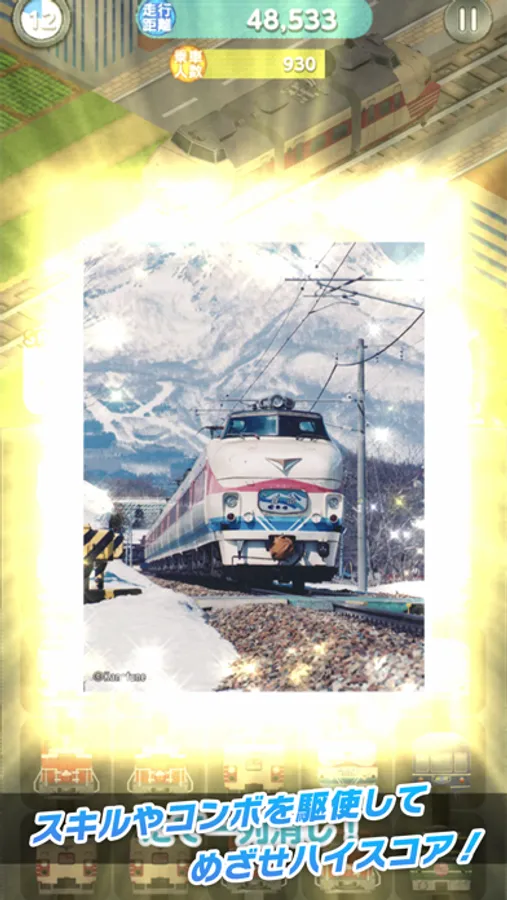 ナツテツ列車をレベルアップさせ、コンボ(連鎖消し)や列車のスキルを駆使してハイスコアを狙います。